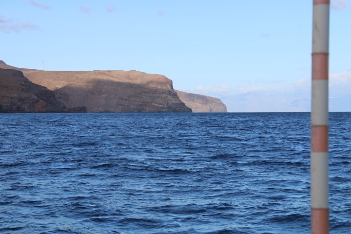 In der Marina dann Segel ins Dinghy und ab. Mit dem Wind war es sehr komod „nach Hause“. In der Guancha-Bucht hauen Böen rein mit bis zu 25 kn. Und Internet ist hier auch sehr mäßig. Ein wenig ärgere ich mich über mich selbst, dass Internet ein Standort-Thema ist für mich. Wo bleibt da die Einsamkeit des Segelns? Aber beides zusammen lassen mich den Anker auf nehmen. Mit knapp einer halben Meile Abstand zum Ufer lasse ich mich unter Fock nach Santiago treiben. Doch aus den zweieinhalb bis drei Knoten werden dann zwischendurch auch gerade man so 5 Knoten. Nur unter Fock. 15 kn Wind. Das ist angenehm! Innerhalb einer Stunde bin ich (fast) da. Hatte eher mit 2 gerechnet. Dann dreht der Wind auf West. Genau von Vorn, aber weniger als 7 kn. Motor an – es ist sowieso keine Meile mehr. Der Vorteil der Fock: Mit dem eFurler ist die quasi nebenbei eingedreht. Dann muss schon der Anker klar gemacht werden. „Mein Platz“ – die Stelle, auf der wird damals lagen, ist gut frei. Andere Ankerlieger haben sich weiter außen hingelegt. Prima! Anker werfen, Deck abspülen. Feierabend! Ankerbier!
