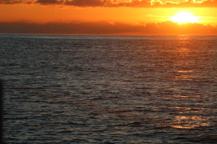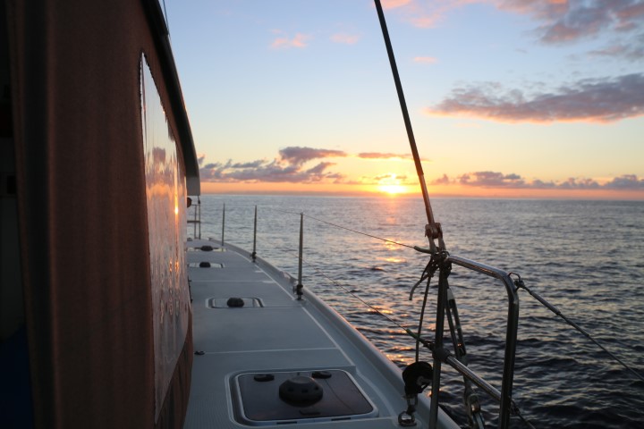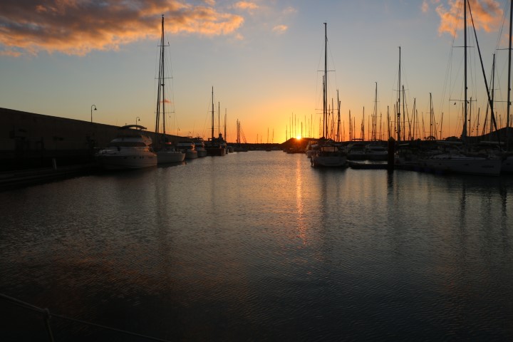 Habe von meiner Lieblings-Capitaineria Nerea die Nachricht bekommen, dass sie einen Platz für RE hätte. Hab ich gleich zugeschlagen. Und so beginnt der Tag – natürlich mit Dämmerung – und Ankerauf. Idealbedingungen zur Überfahrt wäre Westwind. Aber recht schwacher Wind aus Nord ist dann die zweitbeste Option. Haben wir heute! Fast spiegelglatter Atlantik, gut gefüllte Fock – es geht dann auch deutlich schneller als ich voraus berechnet hatte.