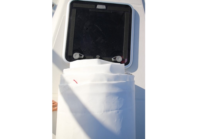 Das Tagesprogramm hört sich einfach an: Segel verstauen. Die beiden neuen Focks sollen „unter Deck weg“. Natürlich in der Vorpiek. Da müsste so gerade noch Platz neben den Notfall-Utensilien und dem Spi und dem Para und… Oh! Es sind doch eine Menge Sachen darin! Problem sind die doch recht kleinen Luken der Vorpieks. Warum Lagoon bei einem so großen Schiffchen keine ordentlich großen Luken für die ansprechend große Vorpiek einbaut: Sicher mach das noch mal ein paar Euro mehr Gewinn. Und die Leidtragenden sind die Eigner. Doch – mehr als 90% der Produktion geht wohl in den Charter. Das zählt so was nicht. Also ans Werk: Zunächst aber muss ich feststellen, dass mein Augenmaß gut ist: Die Packen gehen so nicht durch die Luke! Das erste Bild zeigt dann auch: Es sind min. 5 Zentimeter zu viel. Auch wenn man es diagonal probiert!