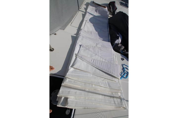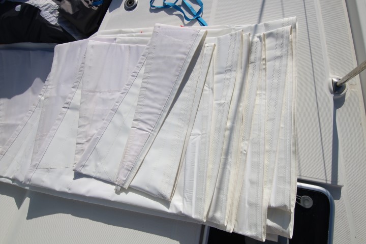 Aber vor dem Verstauen kommt die Inspektion. Also: Die alte Fock runter, die beiden neuen einfädeln und hoch. Der kurze Satz dauert alleine, wo ich mal nach vorne springe, dann wieder aufs Dach, um ein paar Zentimeter einzufädlen und dann am Mast hoch zu ziehen, eine lange Zeit. Doch dann bin ich hochzufrieden: Das sieht alles sehr schön aus.