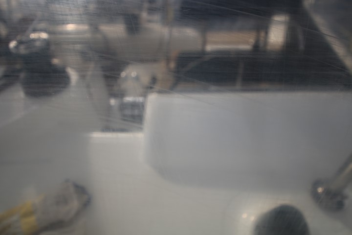 Nun zeigt die Frontscheibe auch Kratzer. Zunächst nur feine. Vom „Abziehen“. Also nach dem Wischen mit einem dicken Schwamm ziehe ich den Restwasserfilm ab. Eigentlich ganz gut. Aber anscheinend sind dann immer noch genügend Salzkristalle auf der Scheibe, dass es feine Riefen zieht. Und beim letzten Säubern hatte ich im Direkt-Sichtfeld ordentlich gewischt. Zu ordentlich. Das sind nun Riefen, die ich nicht mehr „fein“ nennen kann. Das muss also auch „behandelt“ werden. Hier und heute. Aber gleich richtig. Ich habe ja eine feine Maschine, mit der man auch prima polieren kann. (Schleifen mit so einer habe ich bei Peter gelernt, als ich den ganzen Holzbau gemacht hatte.) Das Problem: Die Maschine ist schnell aufgebaut, nur wo ist das Polish. Ich durchsuche alle Ecken, an denen das hingehören würde. Nichts! Hinsetzen, Tee trinken, nachdenken! Ergebnis: Noch ein paar Ecken. Gehört nicht wirklich da hin, aber… Und wieder: Nichts. Ich bin verzweifelt, weiß ich doch absolut sicher, dass ich die Tube an Bord habe. Nun durchsuche ich auch die Stellen, die nicht in Frage kommen. Wieder: Nichts! Dann muss ich aufgeben. Noch ne Pause. Dann fällt mir ein: Ich habe ein Eimerchen von der Bootswerft Winkler bekommen mit einer fein zusammengestellten Ausrüstung für Gelcoat-Reparaturen. Da könnte… Und ja: Da ist! Hurra! Nur hat mich das Ganze dann mehr als 2 Stunden gekostet!
