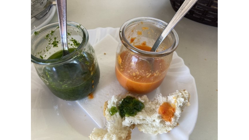 Im nahen Restaurant gibt es Kaffee und Brot mit rotem und grünem Mojo. Super – selbst gemacht, saulecker! Beim Rausgehen macht Yoshi dann den „Wind-Film“. Eigentlich wollen wir den kompletten Wander-Weg. Aber der führt an der Luv-Seite des Berges entlang und bei dem Wind bläst es ständig Sand in die Augen. Meine Beiden beschließen: Lieber im Windschatten des Berges den bekannten Weg zurück. Und dann noch ins Ausgangsdorf, zumindest die Kirche besichtigen. Von außen, denn sie ist verschlossen.