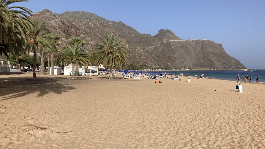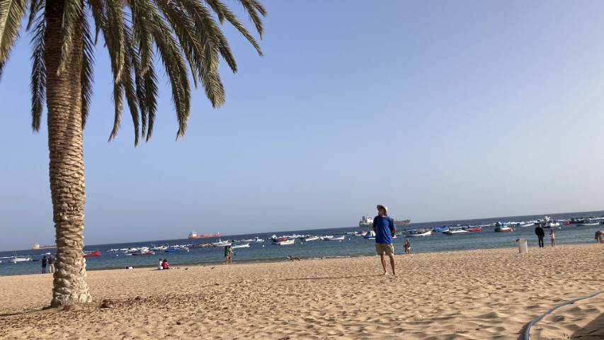 Auf meinen Wunsch hin geht es nun nach San Andres zum Sahara-Strand. Den haben die wirklich in den 70er Jahren mit ein paar Schiffsladungen aus der Sahara hier her geholt, damit sie den Touristen auch „gelben“ Strand bieten können. Ansonsten haben die Kanaren ja eher, wenn überhaupt, schwarzen (Lava-)Strand zu bieten. In der Strandbar gibt es einen Kaffee. Dann geht es zurück.