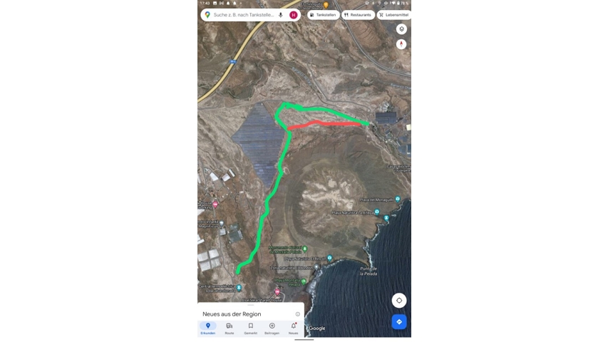 Michèle fängt sogar noch an, Chrome zu putzen! Ich möchte eine letzte Einkaufstour machen. Damit es etwas schneller geht, mit dem Fahrrad. Rausholen, ins Dinghy, an Land, zusammenbauen, zur Straße schieben, losfahren. Doch nach 2 Kilometer ist die Teerstraße zu Ende. Auf die Autobahn will ich nicht und so bleiben die Feld-Nebenwege. Und die entwickeln sich dann zu Trampelpfaden. Abenteuer Einkaufsfahrt. Michèle hatte mich schon gewarnt. So beschließe ich, die Rücktour lieber „unten“ zu machen. Das ist zwar fast doppelt so lang, aber der Weg soll ja viel besser sein. Die ersten 6 Kilometer gehen auf Teer abwärts. Nach 12 Minuten stehe ich dann am Ende des Weges. Michèle ist den ja schon öfter gegangen, aber ich bin Neuling. Und finde den Einstieg nicht. Also: Bild machen, an Michèle schicken, Frage: Wo muss ich lang? Rückantwort kommt geschwind: Oh, da bist Du vollkommen falsch! 2 Kilometer zurück und dann landeinwärts! Als gutes Zwischenziel gibt sie die Thermoelectrica an. Die große Schüssel, mit der man früher mal versucht hat, Sonnenenergie in Strom zu wandeln. Das kennt auch mein Maps und der Weg bis dahin ist mit dem Fahrrad fahrbar. Doch dann geht es wieder auf „Bergpfade“. Ich schiebe. Und freue mich, dass so ein Einkauf doch ein rechtes Abenteuer ist. Zwischendurch telefonieren wir, schicken Bilder. Wo ich denn lang muss, welche Abkürzung ich besser nicht nehmen soll. Ich komme mir vor wie eine ferngesteuerte Unterhose. Doch da kommt dann das nächste markante Zwischenziel in Sicht: Ein riesiges Solar-Feld. Danach gibt es wieder Terrstraße für mich. Super. Abwärts. Doch ein verschlossenes Tor versperrt die Weiterfahrt. Super – wieder auf Trampelpfaden das Fahrrad und den Einkauf um das Fabrikgeländer außen herum schieben. Nächster Orientierungspunkt: Eine Hundepension. Schon früh höre ich, dass ich auf dem rechten Pfad bin! Und dann endlich wieder RE in Sicht und bald auch Teerstraße. Rechtzeitig vor Sonnenuntergang bin ich wieder an Bord. War es nun Tortur oder Abenteuer? Mit dem guten Lotsendienst eher Abenteuer! Wie genieße ich moderne Technik, dass wir Bilder schicken können, telefonierend Anweisungen geben können. Ohne hätt ich den Weg zurück machen müssen und wäre in die Dunkelheit gekommen!
