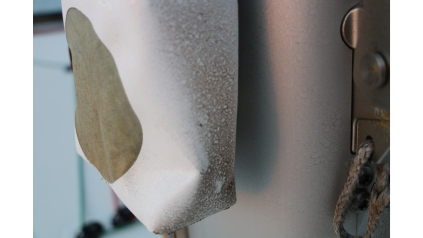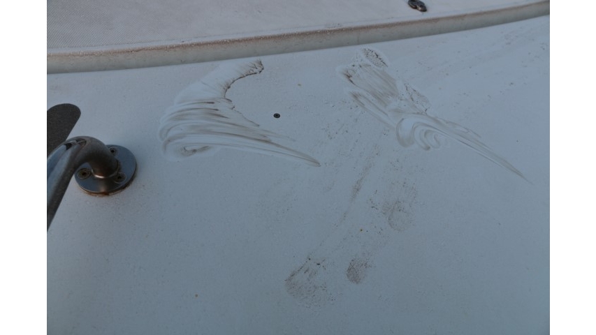 Endlich ist es so windstill, dass die Passat-Fock gesetzt werden kann. Doch erst mal muss sie aus der Vorpiek rausgeholt werden. ParaSailor raus und aus dem Weg: Ab aufs Dach. Dann die beiden Säcke mit den neuen Focks raus. Die alte Fock bergen. Doch nicht ganz, müssen doch erst die Reffpunkte übertragen werden. Also die alte Fock ausbreiten, die neue drauf legen. Punkte aus selbstklebenden Segelstoff habe ich schon zugeschnitten. 12 Stück müssen aufgebracht werden. Drei links, drei rechts. Und das auf zwei Segel. Da bin ich schon einige Zeit mit beschäftigt. Denn um sie möglichst exakt an die gleichen Stellen zu bekommen, muss ich hin und her turnen. Und nur nicht auf die neuen Segel treten, denn meine Füße sind arg schmutzig. Das ganze Oberdeck ist eine einzige, schmierige Salz-Staubschicht. Sch…. Kalima!