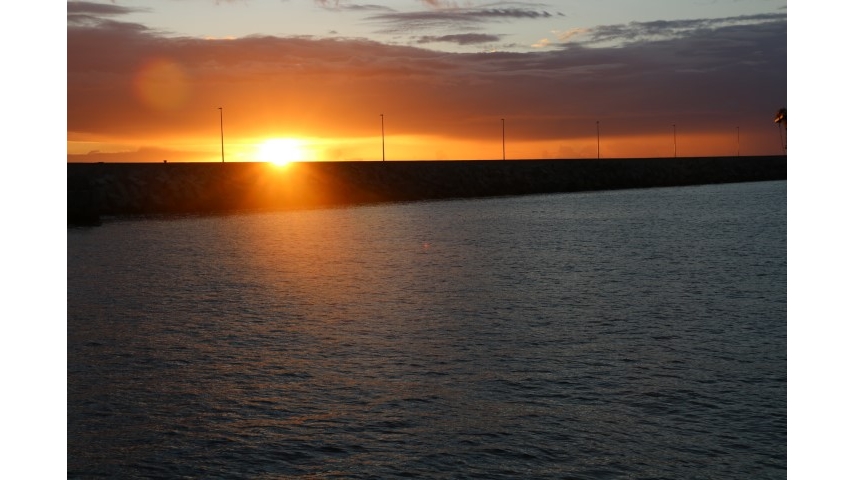 Das Setzen der beiden Focks bekomme ich allein nicht hin, Michèle wird geweckt und muss ohne Kaffee mithelfen. Nun gut – sie bekommt einen Kaffee, aber darf sich nicht gemütlich in die Ecke setzen, sondern muss den mit in den Steuerstand nehmen…. Dann werden beide Focks gleichzeitig Zentimeter für Zentimeter hoch gezogen. Endlich steht alles, noch einrollen. Die alte Fock würde ich gerne abgespült verpacken, aber das dann mit Süßwasser. Das wird ein wenig auf sich warten lassen. Ja – den ParaSailor wieder verstauen und dann darf ich – nein, nicht Pause machen. Das Oberdeck muss zur Fahrt sauber sein. Zumindest der Staub muss weg. Wir haben ja nun eine Deckswaschpumpe. Zwar mit Salzwasser, aber die nächsten 2 Stunden wird jedenfalls der Kalima-Staub aus der Sahara von Bord gewaschen. Dann noch mit Süßwasser alle Griff-Stellen entsalzen. Gut! Jetzt sind wir klar zur Abfahrt.