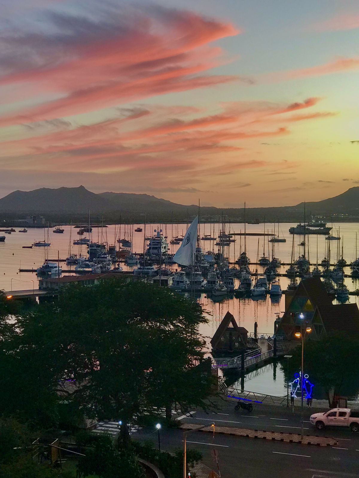 Zum Tagesabschluss bekommen wir ein Bild von Olaf: Blick von Mindelo über die Abend-Bucht und damit auch Suchbild: Wo ist RE???