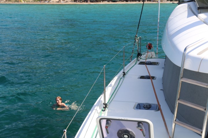 Am späten Morgen dreht Monika ihre Runden - ums Schiff. Und nachmittags machen Michèle und ich uns mit dem Dinghy auf zu einem „Snorkeling Spot“. Wunderbar geschützt. Wir können uns nur nicht einigen, ob das Wasser da wärmer ist. Ich meine: Ja! Das wäre genau die richtige Umgebung für Monika, das mit dem Schnorcheln mal zu probieren. Doch sie wollte lieber an Bord bleiben…. Gut: Kristallklar ist anders, aber insgesamt sehr nett. Damit Monika sieht, was sie verpasst hat, mache ich Fotos en masse. Und ein paar Filmschnipsel. Ist dann hinterher wieder schwierig, das auszusortieren.