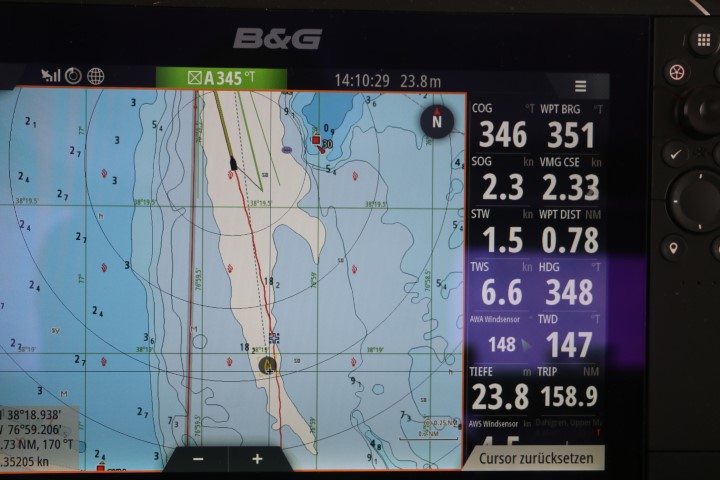 Dann „frischt“ der Wind ein wenig auf. 4, 5, teils 6 kn! Und damit rast RE dann mit 2, manchmal sogar fast 3 kn stromauf! Hatte ich erwähnt, dass der Strom schiebt?