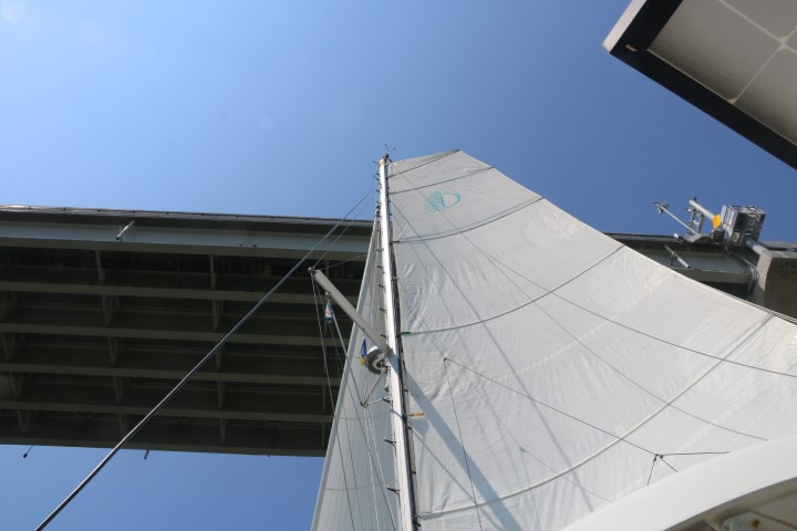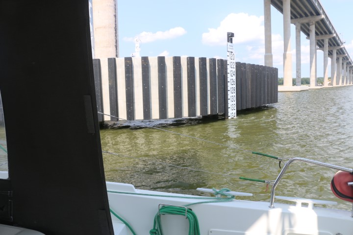 Spannend dann meine erste Hochbrücke! Passt RE mit dem Mast von 72 Fuß da drunter her? Das Seehandbuch sagt 133 Fuß. Müsste also – aber spannend bleibt es bis dann die Antenne NICHT an der Brückenunterseite kratzt! Und klar: Genau in der Enge zwischen beiden Pfeilern kommt mir ein kleiner Schubverband entgegen.