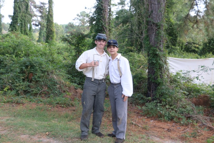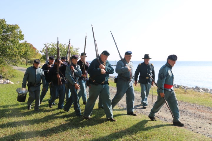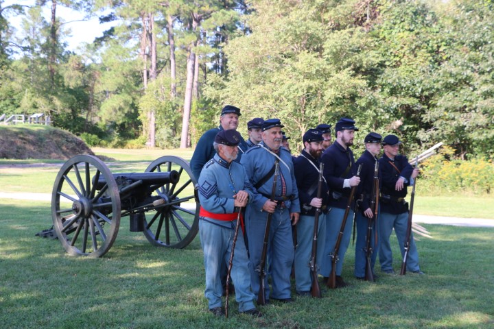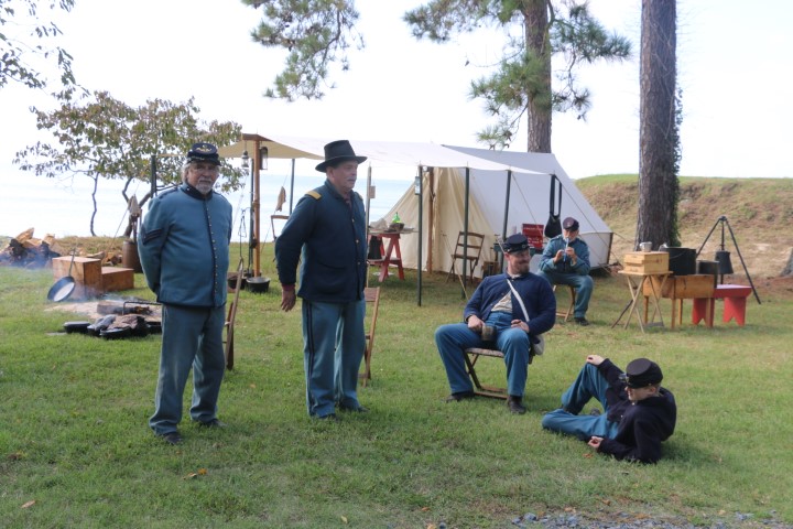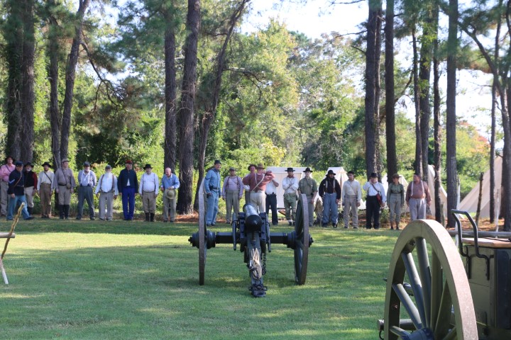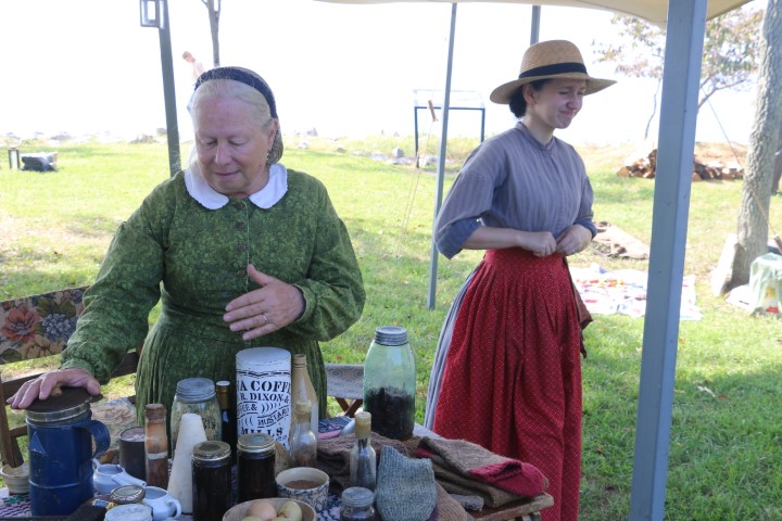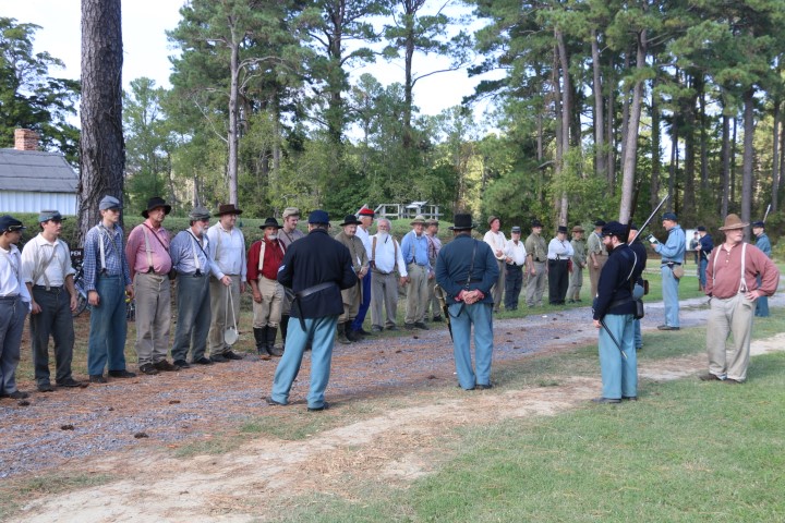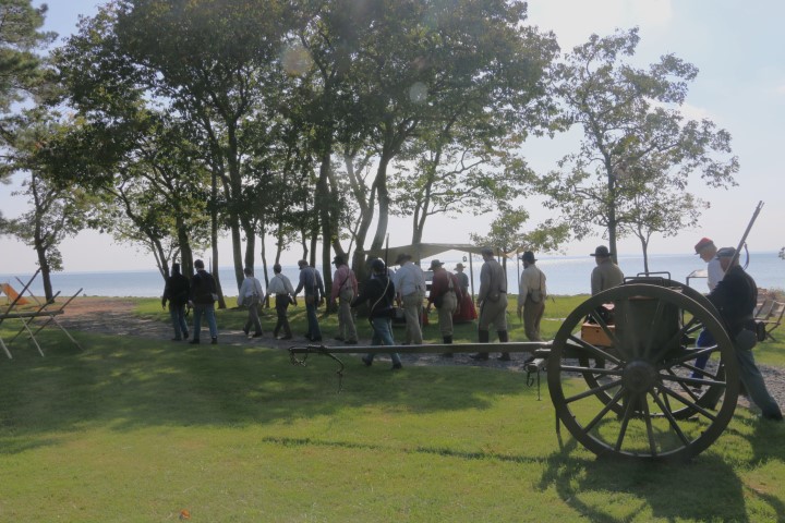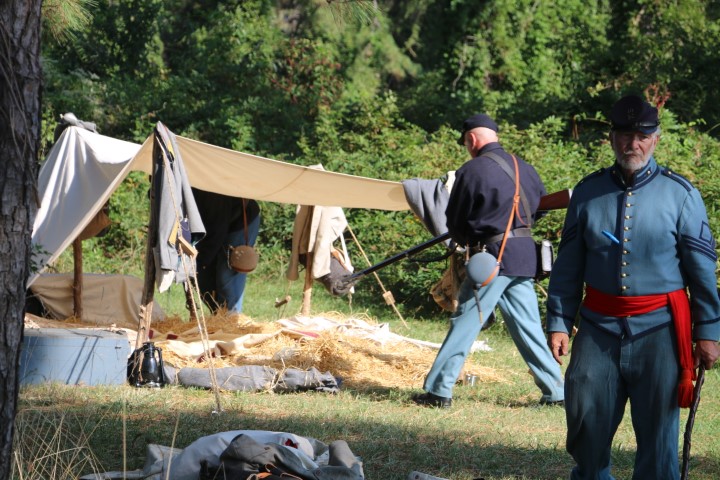 Mittags ziehen wir rüber. Zum Camp! Inzwischen sind eine Menge Akteure da. Zwei Handvoll „Union“-Soldaten, so in der Größenordnung 20 „gefangene Konföderierte“. Dazu dann eine Marketenderin. Sie erklärt uns einen Tisch voll Dinge aus dem damaligen Leben. Seife aus Pottasche, eine Tagesration Kaffeebohnen, Hartbrot, Bekleidungsstücke und vieles mehr. Bald eine halbe Stunde schwatzen wir mit ihr. Und klar – bei den Akteuren ist Aktion. So müssen die Wachsoldaten antreten und ins Gefangenenlager marschieren. Dann werden die Zelte durchsucht. Irgendwann mal wird die Kanone abgeschossen. Und dann herrscht wieder „Lagerleben“. Herrlicher Sonnenschein macht den Tag wunderschön. Wieder diskutieren wir die präsentierten Dinge. Die Uniformen werden uns erklärt, die Rangabzeichen, das Lagerleben.