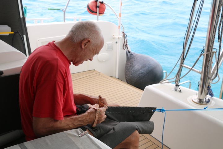 Den Nachmittag verbringe ich mit Näharbeiten. Aber fertig werde ich noch nicht… Die Backbord-Persenning könnte noch Lattentaschen bekommen, der Front-Sonnenschutz im Steuerstand Halter und die Kuchenbude müsste noch eine Verstärkung bekommen….