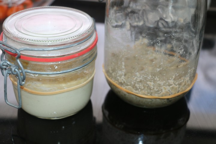 Brot backen beginnt bei mir ja immer mit dem Ansatz des Sauerteigs. Den hatte ich über unsere Abwesenheitszeit in der Tiefkühle. Mochte er nicht. Auch nach 2 „Fütterungen“ und zwei Tagen tut sich da nichts. So setze ich einen neuen Sauerteig an. Hoffentlich wird der was, denn nach bald 9 Stunden ist da auch noch keine Reaktion zu sehen….