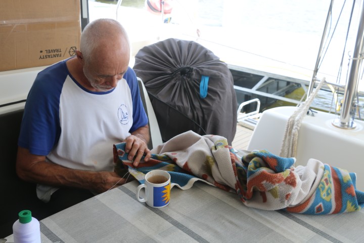 Und das tue ich in ganz kleinen Bewegungen: RE bekommt einen neuen Vorhang, um die Schlafkabine abtrennen zu können. Schon in der ganz kalten Zeit habe ich da eine Fliesdecke so montiert, dass die wenige Wärme „gefangen“ wurde. Und nun mit dem kleinen Klimagerät muss die Kälte gehalten werden. Die Gardinenstange kam mit den Paketen, sie ist montiert und nun muss die Decke zum Vorhang werden, der auch oben gut abdichtet!