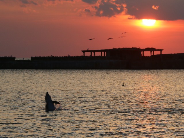 Diese bieten nicht nur Fischen einen gut geschützten Lebensraum, wie wir anhand der vielen Fischer um die Schiffe herum feststellen können, sondern auch zahlreichen Vögeln Nistgelegenheiten, wie wir nicht nur sehen, sondern auch riechen können. Diese Wracks sind schon faszinierend! Leider ist das Wasser zu schlammig als dass es sich zu schnorcheln lohnen würde. Gegen Abend bekommen wir dann noch Besuch von ein paar Delfinen, die wohl auch den Fischreichtum um die Schiffe zu schätzen wissen.