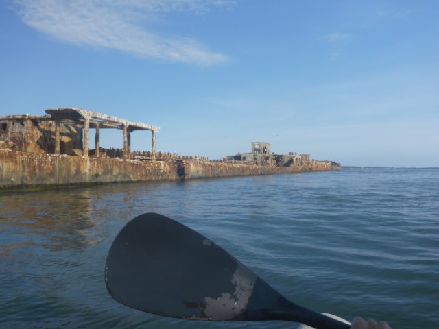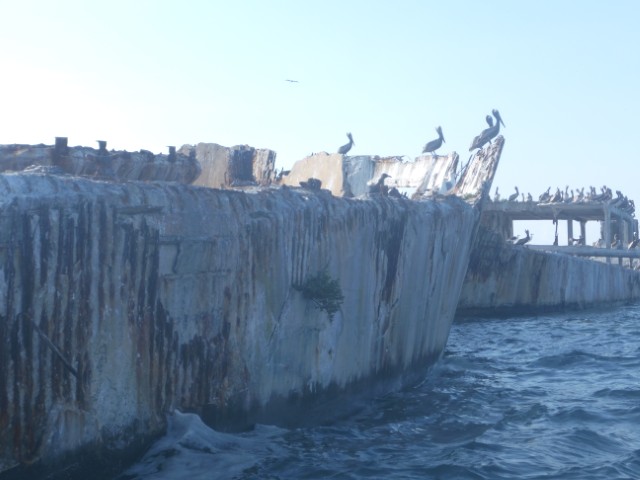Dann kommen wir zu unseren Inselchen. Mit dem Fernglas sieht das ulkig aus. Da liegen jede Menge Schiffe davor – also eher doch nichts für uns. Allerdings sehen die schon eher wie Schiffsfriedhof aus. Naja, mal abwarten und etwas näher ran: Das sind tatsächlich Schiffwracks, aber schon etwas speziell: Es sind die Betonschiffe von Kiptopeke. Dort hatte die Virginia Ferry Commission 1949 einen Terminal für Autofähren errichtet. Und da es dort keinen natürlichen Hafen gab, kaufte sie 9 ca. 100 Meter lange, vom Krieg übrig gebliebene Frachtschiffe, und versenkte diese so, dass sie als Wellenbrecher für das Terminal dienen konnten.