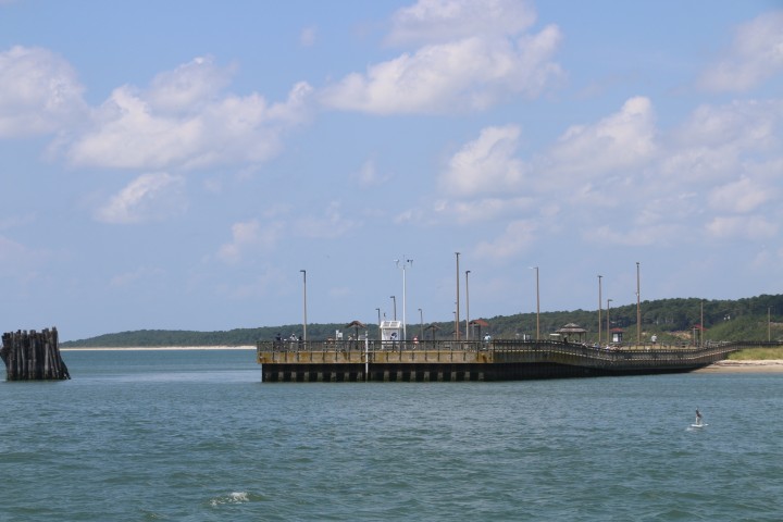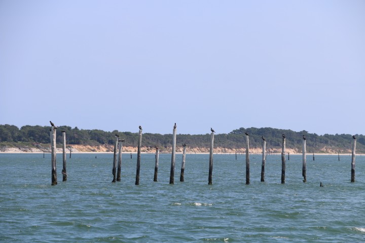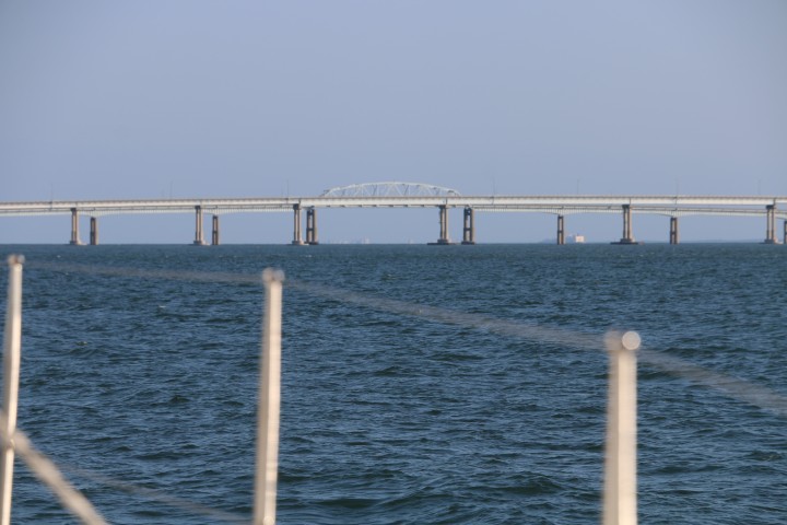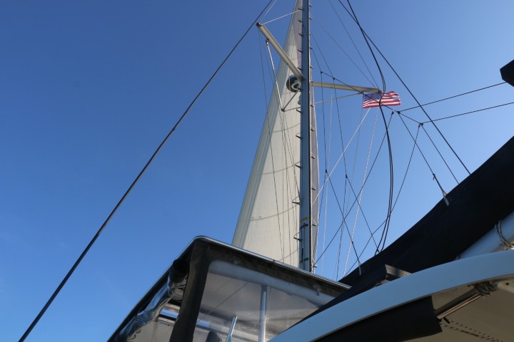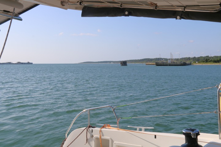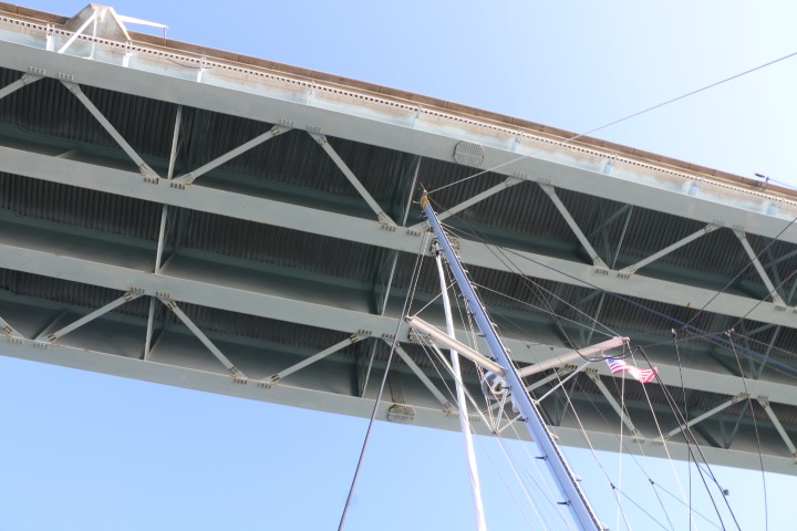 Gleich anschließend geht es für uns raus – auf den Atlantik und dann endlich nach Norden! Anker auf, für ne gute halbe Stunde die Fock zum Motor dazu und dann unter der Brücke der Chesapeake Bridge-Tunnel durch. Das ist für mich das Ende der Chesapeake Bay und damit der Anfang vom Atlantik. Das letzte Mal sind wir im Dezember in der Nacht unter dieser Brücke durch gerutscht. Das ist heute deutlich entspannter…. Dafür aber der bange Blick von Michèle nach oben: Der Mast, also zumindest die UKW-Antenne kratzt doch an der Brücke!!??? Nein – da ist noch mindestens ein Meter Platz! Aber bei 22 Meter sind nur noch 3 Fuß Freiluft!