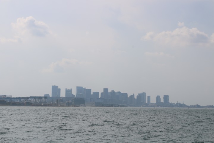Gegen 15 Uhr schält sich die Skyline von Boston aus dem Grau des Horizonts. Wie kurven durch die Inselwelt vor Boston. Und dann kommt die letzte Meile. Segel runter, Motor an und in den inneren Hafen von einlaufen. Gleich das erste Ankerfeld wollen wir nehmen. Doch da sind so viele – leere – Moorings, dass es schwierig mit dem Abstand würde. Also – an eine Mooring. Das Seil der Mooring erzählt mir mit seinem Bewuchs, dass schon viele Wochen, ja Monate hier niemand mehr gelegen hat. Also – wir nehmen niemanden seinen Platz weg.