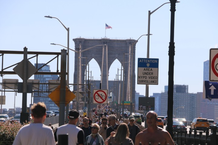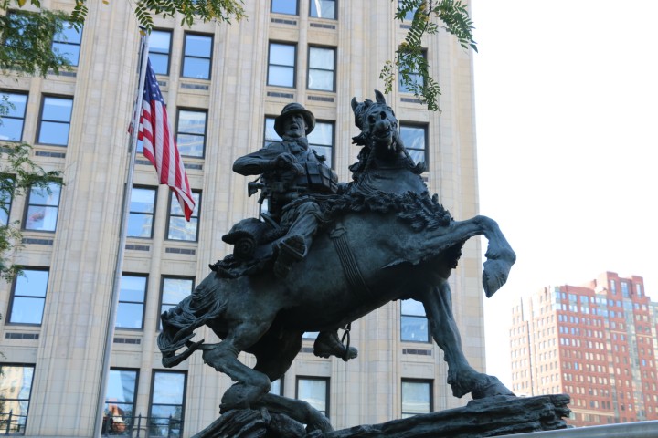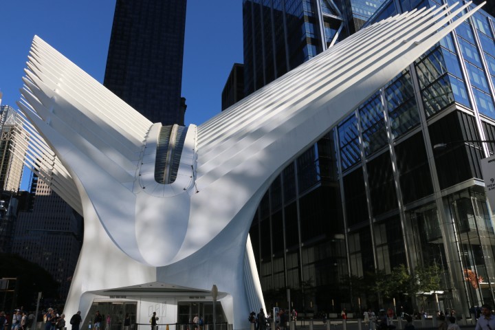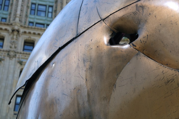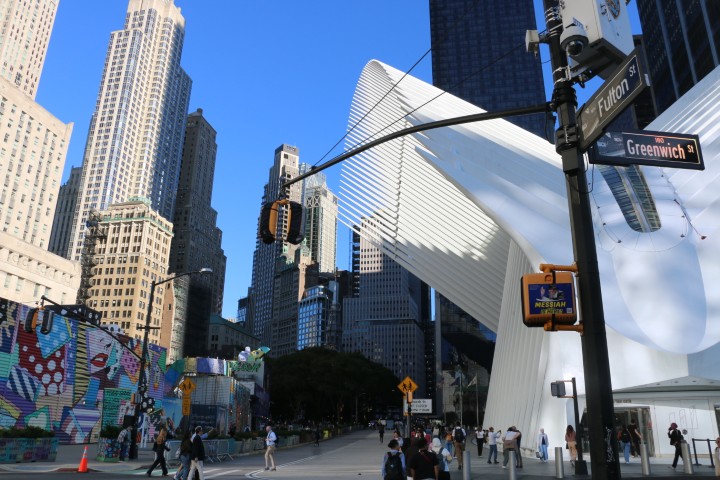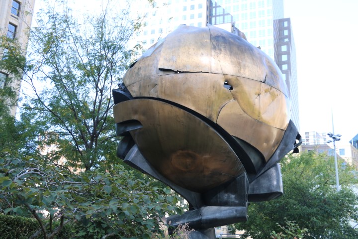 Wie wir so da stehen und diskutieren, höre ich einen bekannten Zungenschlag: ja, es sind Luxemburger! Die muss ich natürlich kurz anquatschen. Danach geht es zum Memorial 9/11. Zuerst kommen wir an einer großen, beschädigten Bronzeplastik vorbei: die Große Kugelkaryatide von Fritz König, welche zwischen den Zwillingstürmen auf dem Vorplatz des WTC stand. Diese mehr als 20 Tonnen schwere Plastik konnte nach den Anschlägen, beschädigt zwar, jedoch weitgehend intakt aus den Trümmern geborgen werden. Nachdem sie erstmals im Battery Park einen Standort gefunden hatte, wurde sie 2017 wieder in unmittelbare Nähe ihres ursprünglichen Standortes versetzt.