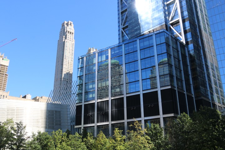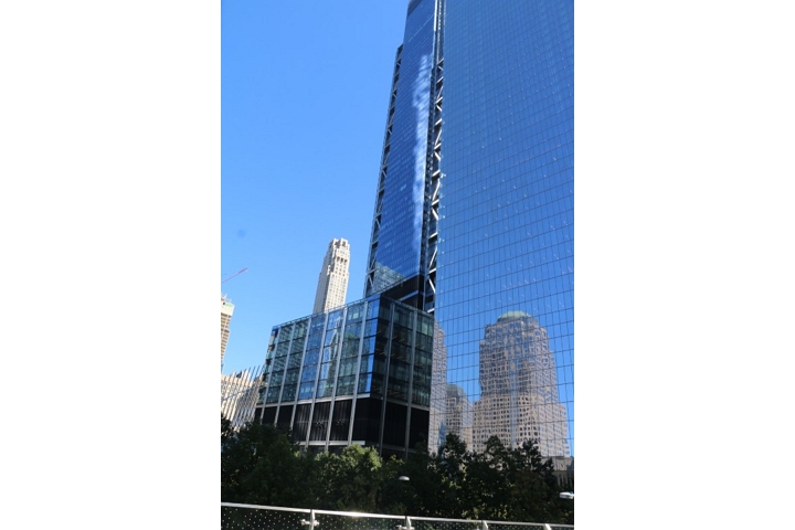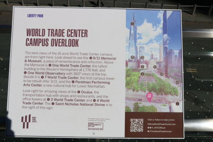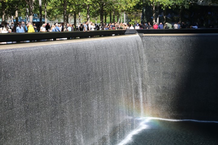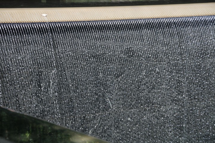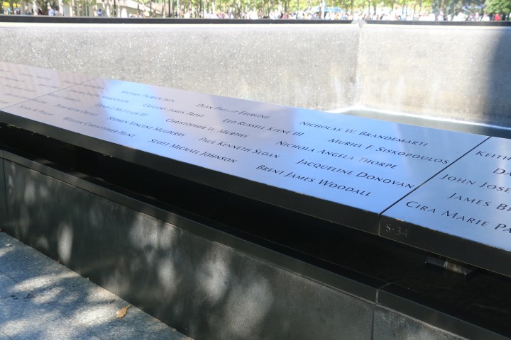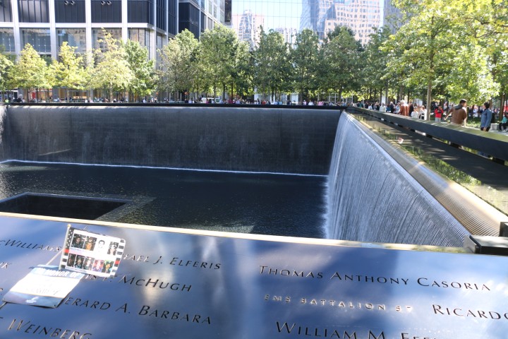 Außerdem erfahren wir (Reiter auf Pferd), dass die Amis u.a. auf Pferden in Afghanistan eingefallen sind. Dann erreichen wir die ehemaligen Standorte der Zwillingstürme. Jetzt 2 Wasserbecken, auch Reflecting Pools genannt, an deren Seiten das Wasser hinabfließt und um den Rand sind die Namen der Menschen eingearbeitet, die bei den Anschlägen 1993 und 2001, sowie der Menschen in den Flugzeugen, umgekommen sind. Dabei symbolisiert das fließende Wasser die „Reflexion der Abwesenheit“ (Reflecting Absence) und eine Leere, die durch die Anschläge entstanden ist.