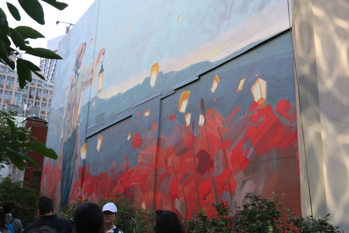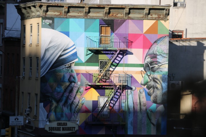 Und schon geht es weiter – wieder zur High Line. Die hat es uns angetan. Den ersten Teil kennen wir, kommen wir doch aus dem Norden. Und dann geht es auf den südlichen – für uns neuen Teil. Wirklich schön! Hier sind die Bäume und Büsche noch höher. Eine Masse Mensch schiebt sich die Line lang. Aber wir empfinde es nicht als störend. Und wie schon berichtet: Kunst, mal links, mal rechts. Und dann auch noch auf der Line selbst.