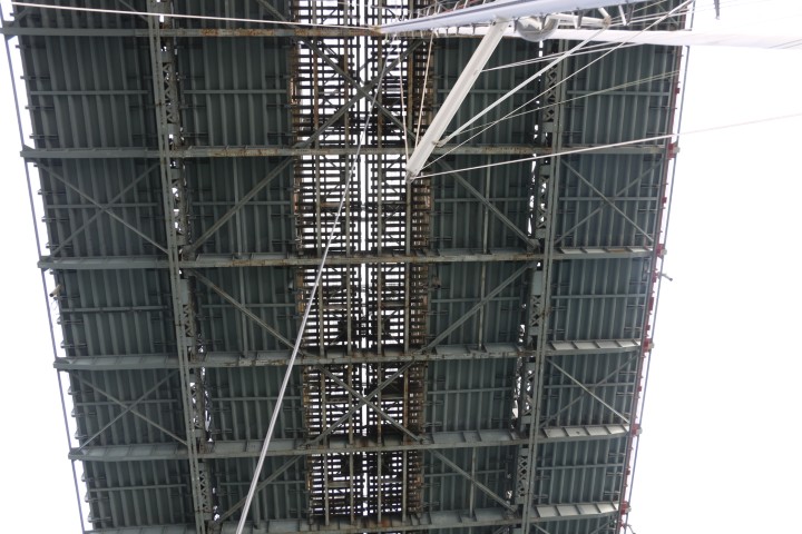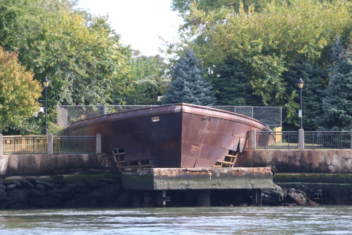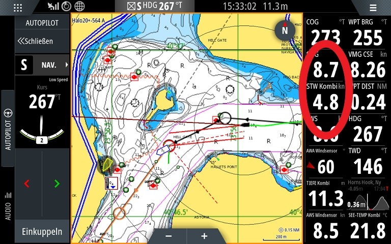 Langsam füllen sich die Felder mit den Durchgangszeiten. Und es geht gut: Fast auf die Minute! Klar – genau im Hell Gate liegt ein Arbeitsponton und klar – genau in dem Moment, als wir ankommen fährt der los – genau auf uns zu. Und hinter ihm kommt ein nicht ganz kleiner Frachter.