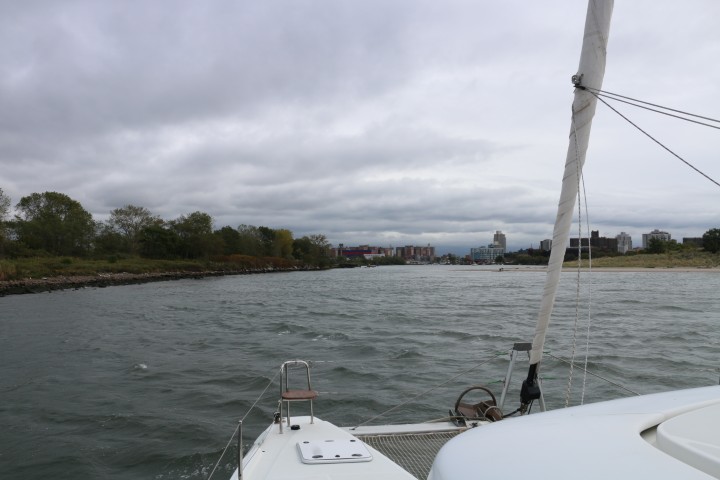 Nach 2 Stunden ein kurzer Abstecher nach links: Einmal ein Besuch der Brooklyn Marina. Anschauen, wie eng das da ist. Wäre eine Alternative, falls wir nochmal herkommen… Auf der letzten Meile flitzen dann die bekannten beiden kleineren Polizei-Boote wie die Wilden vor uns. Eins scheert aus und kommt zu uns. Begrüßung – also sie würden „Übungen“ machen. Wo wir hin wollen. Dann würden sie sich aus unserer Kurslinie raushalten. Also – ich denke, die hatten ein schlechtes Gewissen, dass jemand gesehen hat, was die für Unsinn gemacht haben….