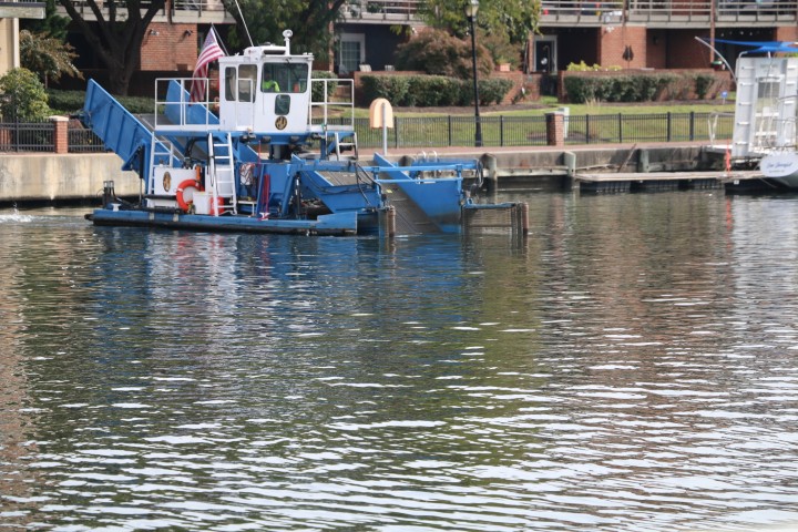 Das Bild des Tages ist dann „mein Freund“. Ein kleines Dreck-Sammler-Boot. Der fährt den ganzen Tag durch den Hafen und sammelt allen Oberflächendreck auf. Vorne zwei bewegliche senkrechte Gitter, dahinter ein Förderband, das den Dreck in einen Sammelbehälter transportiert. Der umkurvt RE mindestens einmal am Tag. Erfolgreich, muss ich sagen. Ich hatte in einem Beitrag von 2020 gelesen, wie saudreckig der Baltimore-Hafen sein soll. Und nun – 2025 – empfinde ich den Hafen aus ziemlich sauber!