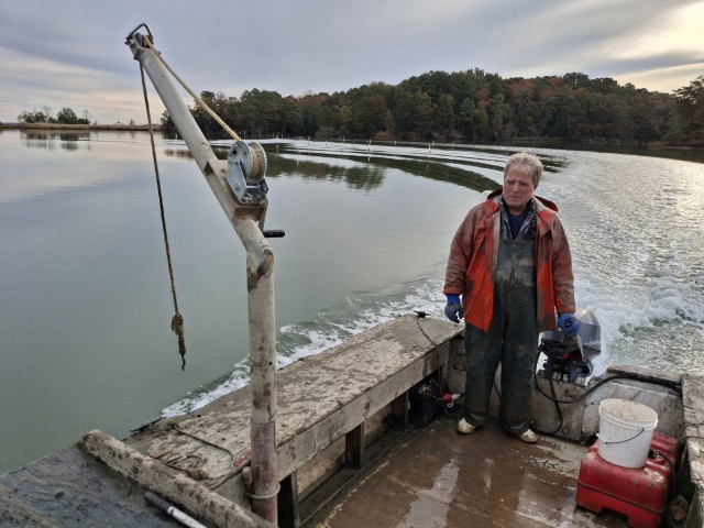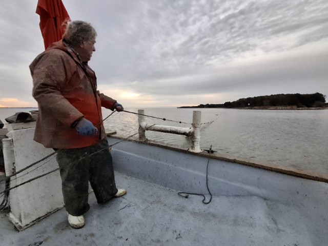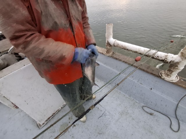 Dann kommt die letzte Schleife und wir sind auf dem Potomac. Der hier für Mike sehr schmal ist. Darf er doch nur in Virginia fischen und das hört wenige Meter nach dem Ufer auf! Das erste Netz steht gleich bei der Ausfahrt aus dem Creek. Eine Möve sitzt schon an. Die ist jeden Morgen da, erzählt Mike. Bekommt aber nicht viel ab. Und ich lerne nun, wie das mit einem Stellnetz funktioniert. Beginnend an dem einen Ende ziehen wir das Netz über die Rohre an Bord und geben es auf der anderen Seite wieder von Bord. Wo sich Fische verfangen haben, wird ein Stopp eingelegt und der Fisch wird aus dem Netz befreit. Dazu hat Mike eine Haken mit einem schönen Griff und zieht die Netzmasche dann über den Fisch. Zack – landet der im Korb. Sieht einfach aus, aber als ich dann dran bin merke ich, dass es nicht ganz so einfach ist…
