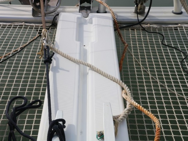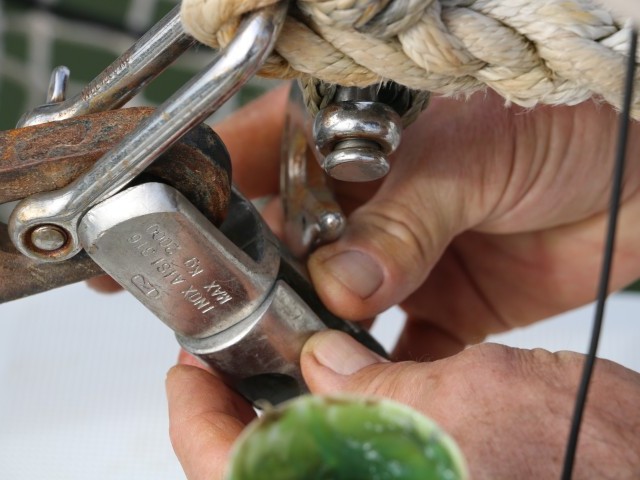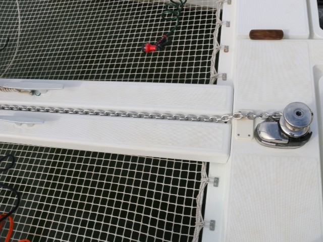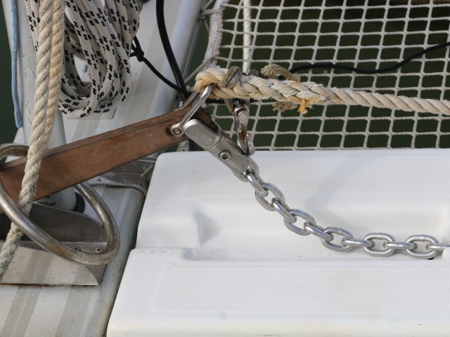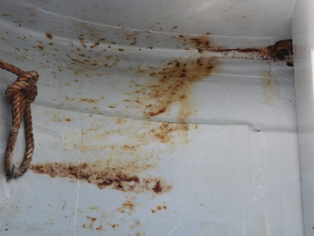 Um kurz vor 10 Uhr bin ich wieder an Bord. Und gleich in Action: Die letzen Durchgänge mit Rost putzen. Die Traverse ist ganz blank und schön weiß. Im Kettenkasten sind noch einige Flecken. Für die habe ich dann keine Lust mehr. Insgesamt sieht auch der Kettenkasten recht ordentlich aus.