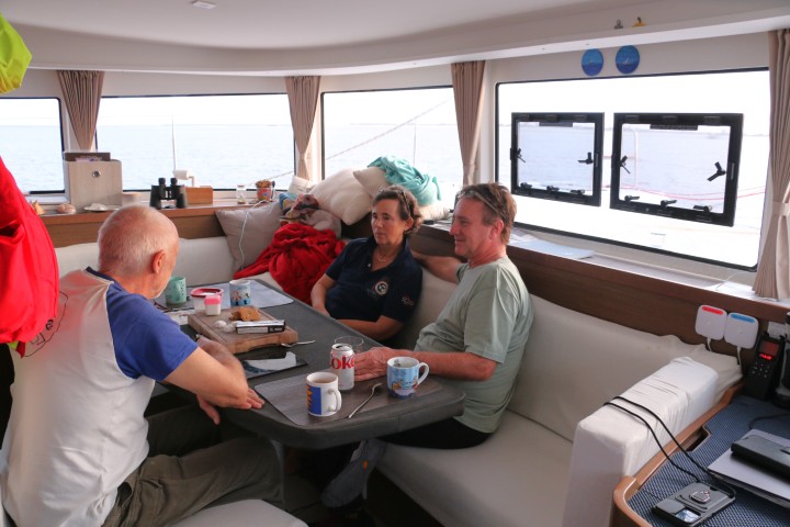 Den Nachmittag verbringen wir mit Jutta und Thomas von der JOBBER. Die wollen auch morgen ganz früh los und so sind sie froh, ihr Dinghy auf dem Vordeck lassen zu können. Denn – klar – ich hole sie gerne ab. Ist das Zuwasserlassen des Dinghys auf RE kein Problem. Nur unwesentlich mehr, als jeden Tag…