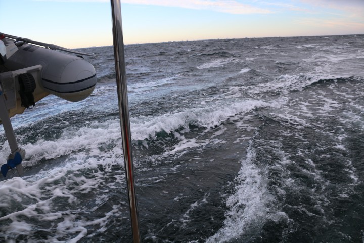 Nachdem wir morgens kritisch viel Wind hatten ist es nachmittags recht wenig. Trotzdem haben wir am Tagesende noch einen Schnitt von über 6 kn. Das bringt RE gut nach Süden.