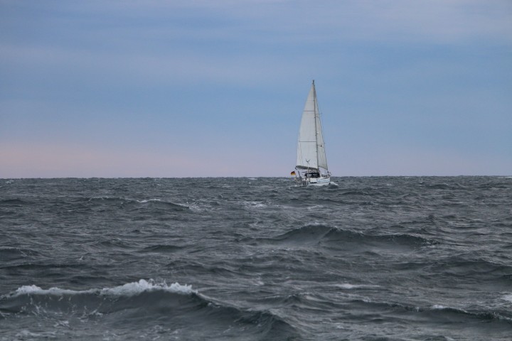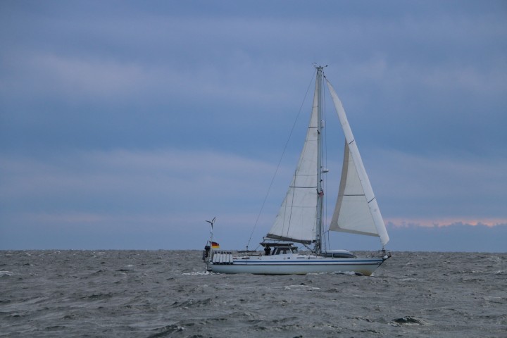 Denn kaum ist die Sonne weg, frischt es wieder auf. Ok – das ist bei Sonnenuntergang so. Doch der Wind hält durch. Nein, er wird sogar stärker. Also – Para runter. Und für die Nacht das Groß gleich in Reff 2. Der Wind nimmt sogar noch ein wenig zu und so gibt es die Fock in Reff 1. Damit wird in der Nacht ziemlich sicher kein Segelmanöver nötig. (Und das passt dann auch.)