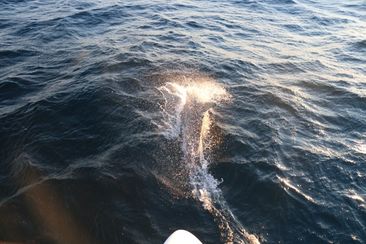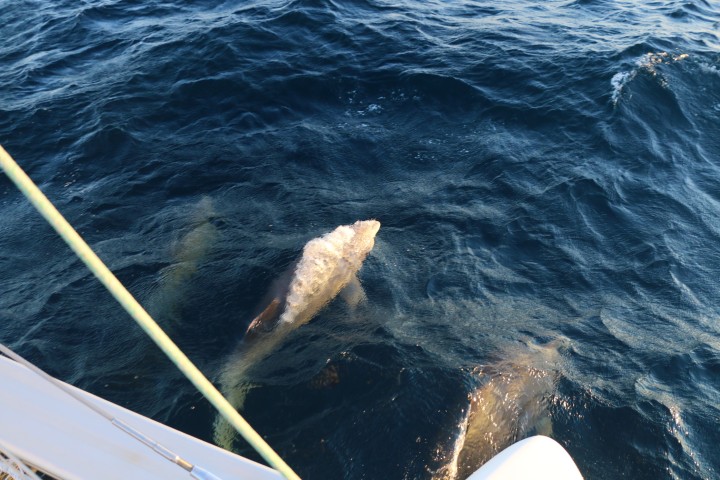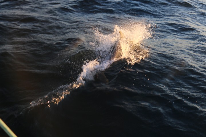 Dann – immer wieder eine große Freude für mich – Delfine! Richtig große. Beim ersten Besuch schaffe ich keine Fotos. Kaum bin ich in Position sind sie weg. Nachmittags beim zweiten Besuch dann aber eine ganze Reihe. Als ich endlich zufrieden in den Salon komme, meint Alisha: Gerade als Du nach hinten kamst, machte einer eine tollen Sprung! Sh….