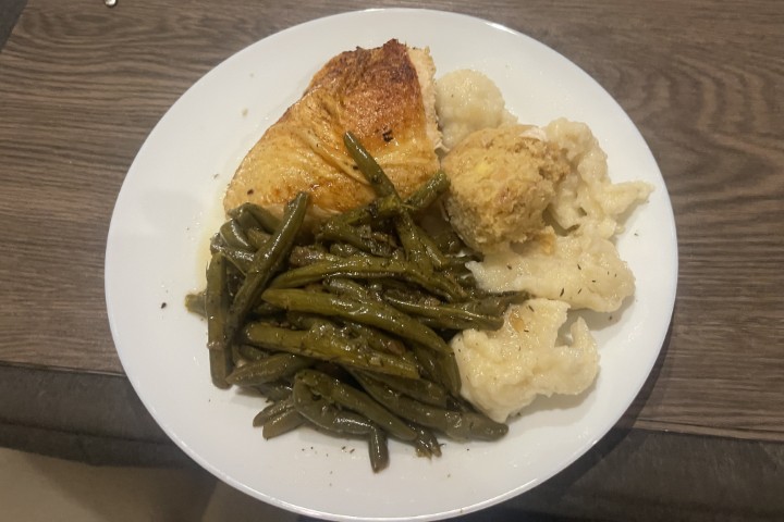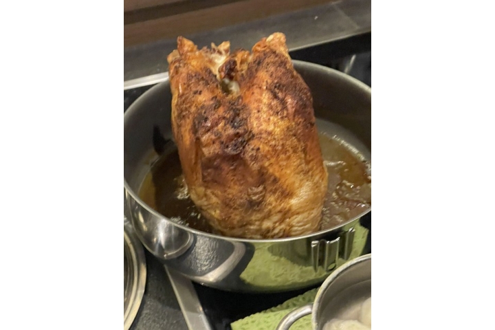 Und dann – ordnungsgemäß amerikanisch – Truthahn gefüllt mit – vielleicht nicht so ganz typisch amerikanisch, aber sie müssen nun langsam gekocht werden – grünen Bohnen. Dazu frische Kartoffelknödel. Die angedachte Sahnesauce fällt dem Wind zum Opfer.