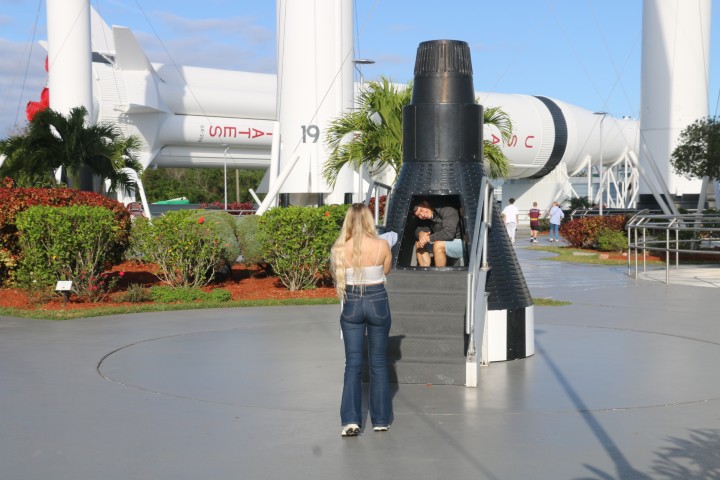 Dann gönne ich mir einen 10 Minuten-Spaß. Heute muss man nicht anstehen. Eine 3D-Virtual Startsimulation. Wir werden in Sitze gelegt, bekommen die 3D Brille auf. Werden in die Rakete gebracht, beim Start durchgeschüttelt. Und können – das können die richtigen Astronauten nicht – nach hinten schauen, wie Startrampe, Cape Canaveral und dann Florida unter uns klein wird. Dann sind wir im Weltraum – kleine Teile schweben in der Schwerelosigkeit an uns vorbei. Und wieder zurück. Bremsmanöver, Hitzeglut und Splashdown. Wir sind wieder auf der Erde….