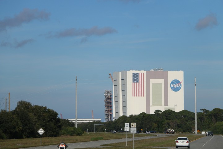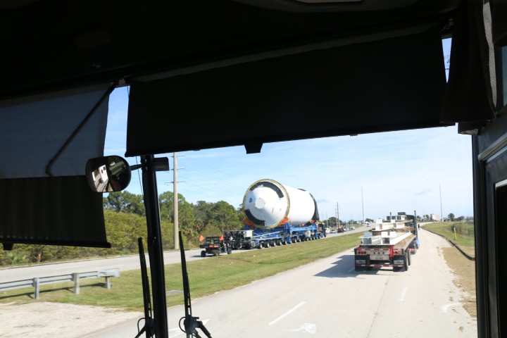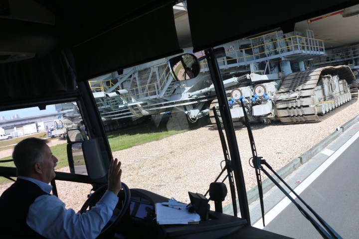 Mit dem Bus geht es dann auf die Startplätze. Am Ende bin ich da über 2 Stunden unterwegs. Heute ist ein Glückstag, denn wir erleben einen Transport eines Raketenteils. Und dann fahren wir an einem der „Crawler“ vorbei – das wahrscheinlich größte Fahrzeug der Welt. Bewegt sich gerade leer zu einem Startplatz, um den mobilen Teil der Startrampe zurück ins „Assembly-House“ zu holen. Mit wahnsinnigen 1 Meile / Stunde bewegt sich das Ding – in Spitzengeschwindigkeit. Die Straßen, über das es fährt, werden mit Stahlplatten geschützt, die dann gleich wieder weg geräumt werden.