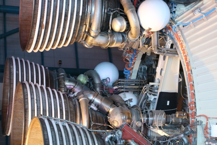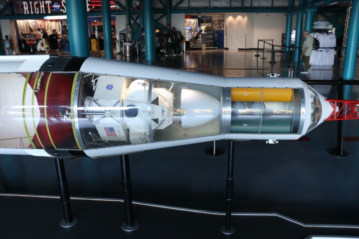 Die Tour geht weiter und führt zum Apollo-Programm. Man wandert unter einer der gewaltigen Saturn V Raketen lang. Ein Modell darunter lässt einen auch ins Innere schauen. Viele Mond-Exponate, ein sogar zum Anfassen. So dass man sagen kann: Ich hatte ein Stück vom Mond in der Hand...