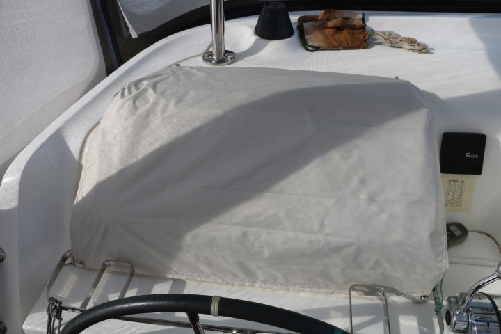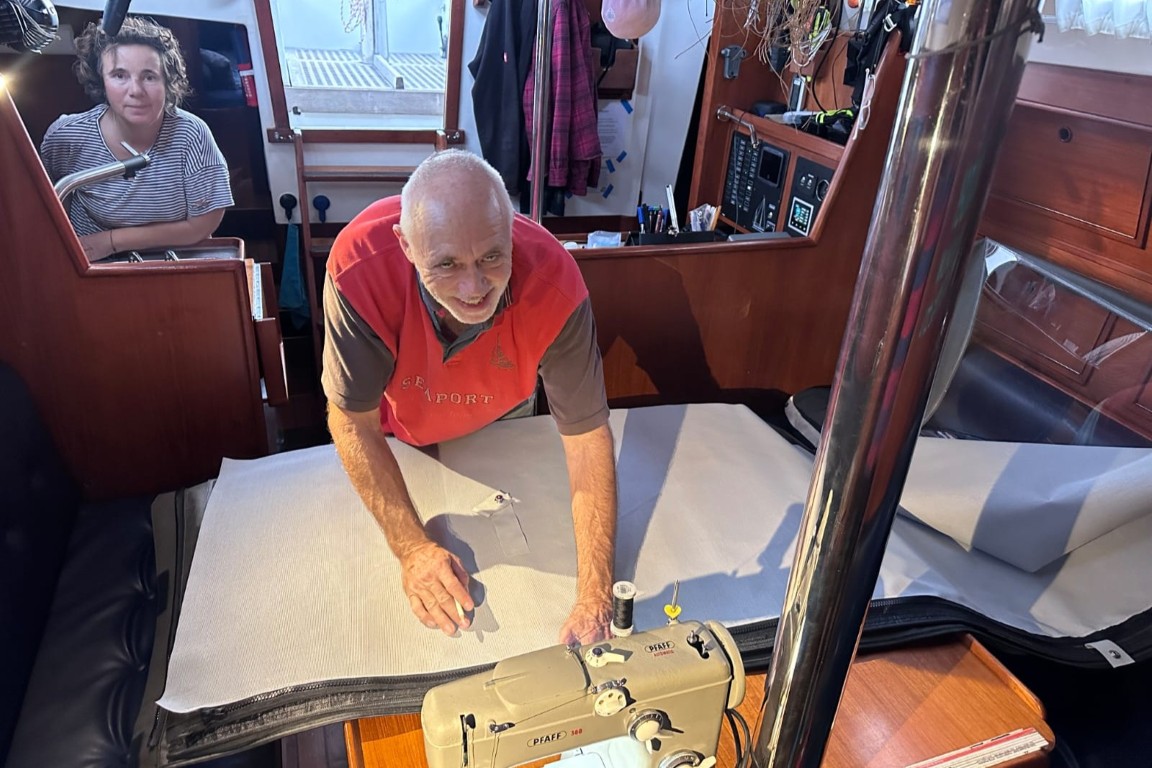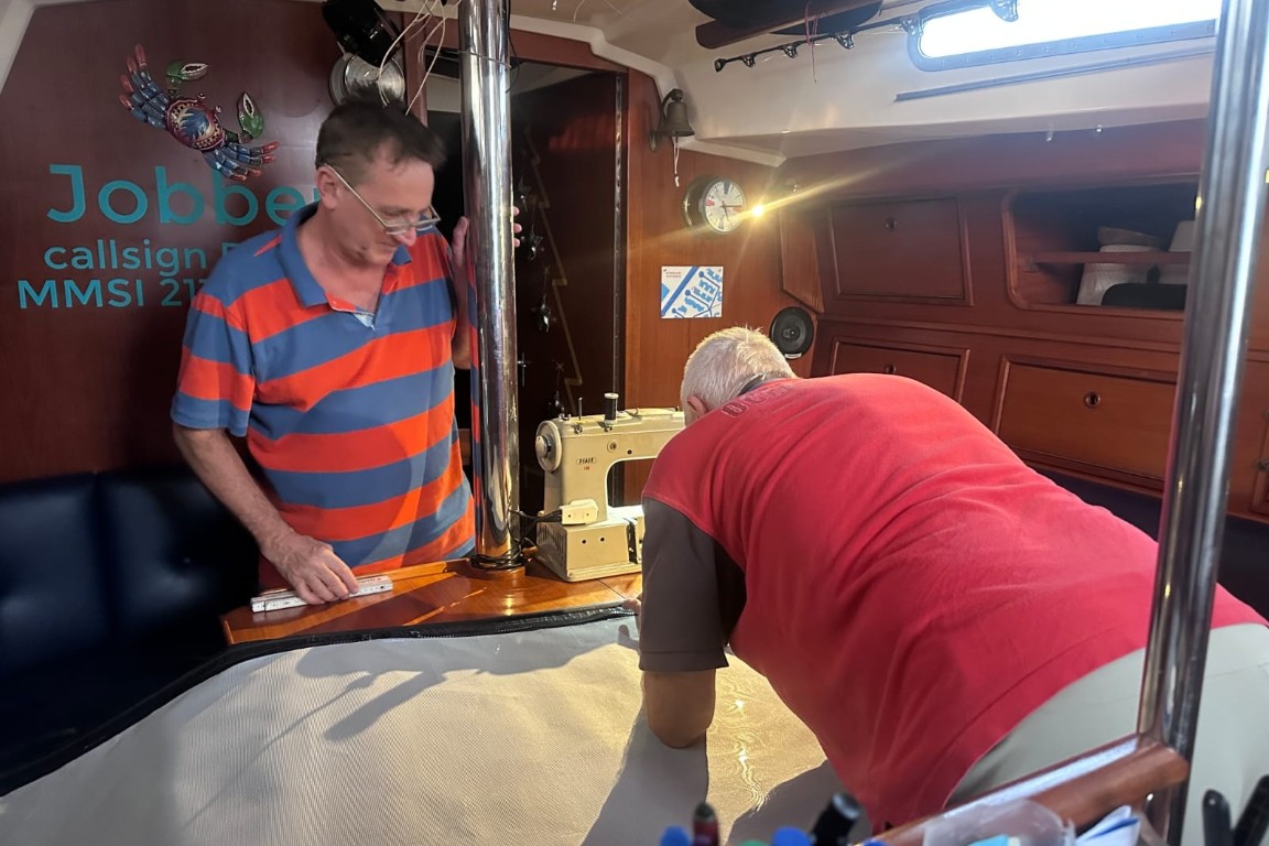 Auf der JOBBER ist heute also Nähzentrum. Und da das mit der Haube so gut geklappt hat und da Thomas fragt, ob er noch was… Also: Ja – ich habe da noch 2 Meter an der Persenning. Aber ob seine Maschine das kann? Er meint: Ja. Also hole ich die Frontscheibe und ja – es klappt! Nicht ganz einfach, aber am Ende hat die Frontscheibe auch zwei Reißverschlüsse, an denen der Sonnenschutz angebracht werden kann.