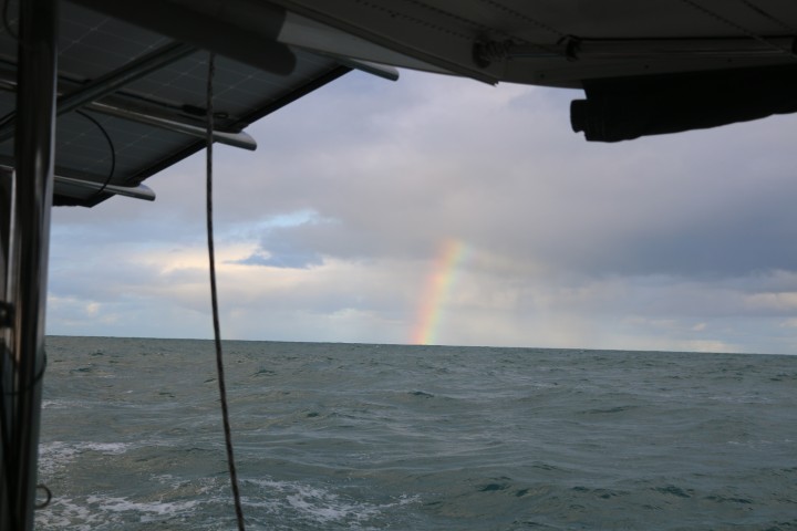 Ab 15 Uhr beginne ich mit dem „Schlafen“: Anfangs kann ich noch mit 20 Minuten beginnen, dann klingelt der Wecker. Ein Blick rundum und noch viel wichtiger: Stimmen Kurs und bei den wechselnden Verhältnisse die Segel. Das wird dann in der Nacht schlechter: Je näher ich der Küste komme, desto kürzer werden die Intervalle. Bei ca. 5 kn Fahrt mache ich in 12 Minuten 1 Meile. Bei einem Abstand von ca. 2 Meilen zur Küste wäre ich dann schon nach 10 Minuten gefährlich nahe, wenn RE in die falsche Richtung läuft!