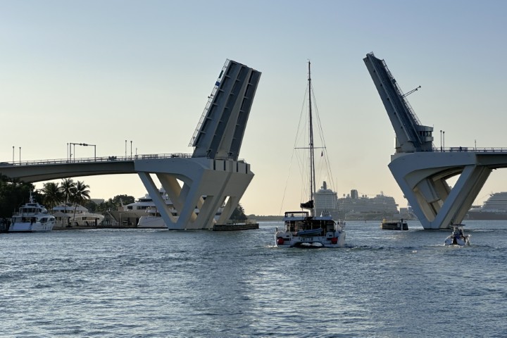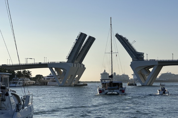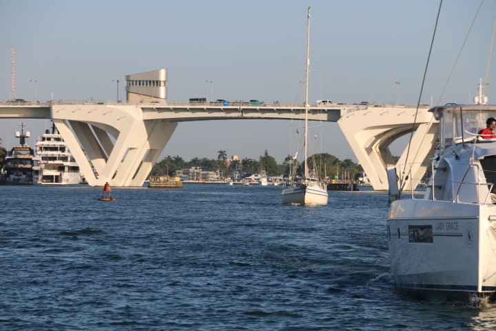 Um kurz nach 7 Uhr wache ich auf. Prima, Zähne putzen und Anker auf! Passt! Und dann klackert es neben mir: Auch der andere Kat nimmt Anker auf. Noch mal prima, wenn ich ins Treiben komme, dann ist mehr Platz. Passiert aber nicht. Und der ICW (Intra Costal Waterway) ist so frei, dass ich sogar in Ruhe die Fender einsammeln, den Anker putzen und ganz langsam fahren kann. Denn die Brücke macht um 08:00 Uhr auf. Beginn um 08:00:00 Uhr!