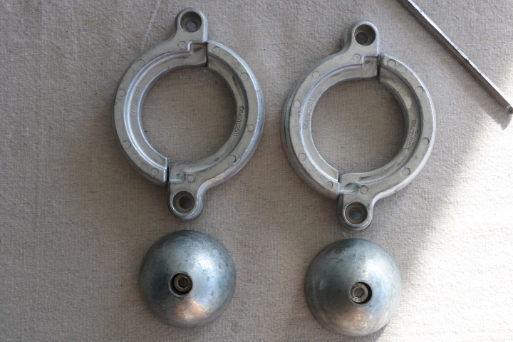 Nach Essensvorbereitung springe ich dann ins Wasser. Nein – nicht zum Vergnügen, die Opferanoden der SailDrives (Z-Getriebe) und besonders der Faltpropeller müssen erneuert werden. Und das war dann wirklich wichtig! Siehe Bilder der alten Opferanoden….