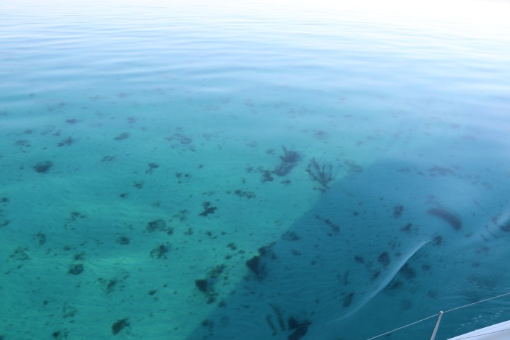 Als ich kurz nach 7 Uhr an Deck komme, strahlt Chrischan über das ganze Gesicht. Warum? Festhalten! Weil es WINDSTILL ist!!! Die Bahama Banks liegen spiegelglatt vor uns. Keine Wellen irritieren die Sicht auf den rund 4m tiefen Grund. Wir können Fische, Seesterne, Korallen, Wasserpflanzen und Co von Bord aus glasklar und quasi vor der Nasenspitze sehen. Wahnsinn!
