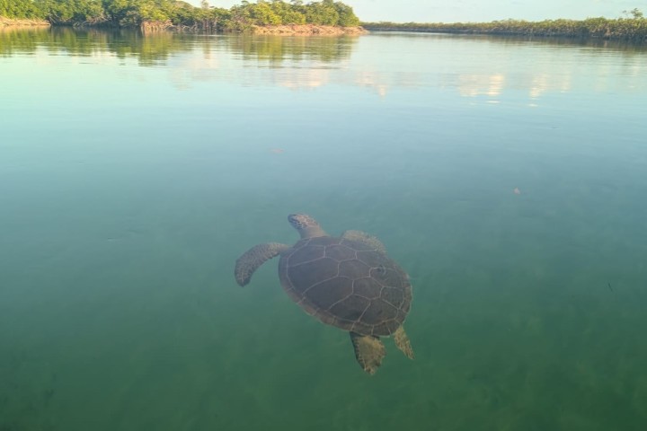 Die Rückfahrt durch die Mangroven gestaltet sich als herausfordernde Irrfahrt durch nicht ganz klar vor sich hin mäandernde, flache, aber sehr klare Salzwasserströme. Wir begegnen mehreren Schildis (Anmerkung Chrischan: Schildkröten!) und können sie sowohl beim Luftschnappen als auch unter Wasser fotografieren und filmen. Um die Tiere nicht weiter zu stressen, geht es für uns dann zurück an Bord.