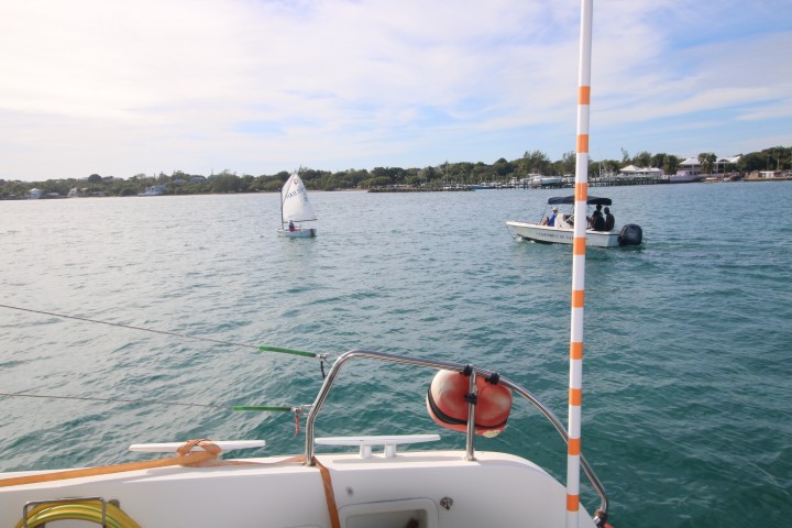 Viel lustiger ist eine kleine Lady. Sehr ernst und konzentriert kommt sie mit ihrem Optimisten wenige Meter unter REs Heck lang. Erinnert mich an meine Kindheit. Mit einem Opti lernt man gut segeln…