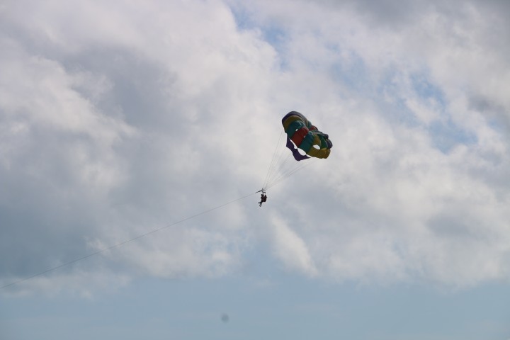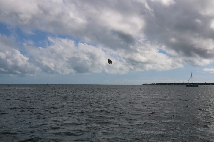 Mitten im Telefonat fahre ich hoch: Ist da wirklich ein Zeppelin? Hier, in Nassau? Kurze Unterbrechung, Fotoapparat geschnappt und raus. Ok – schon beim Ranzoomen merke ich dann: Nein! Kein Zeppelin. Ein Rundfallschirm im Schlepp hinter einem Boot. Eine der üblichen Touri-Belustigungen. So kann ich in Ruhe wieder zur Unterbrechung meiner Arbeit zurück kehren. Telefonieren ist eine wunderbare Entschuldigung!