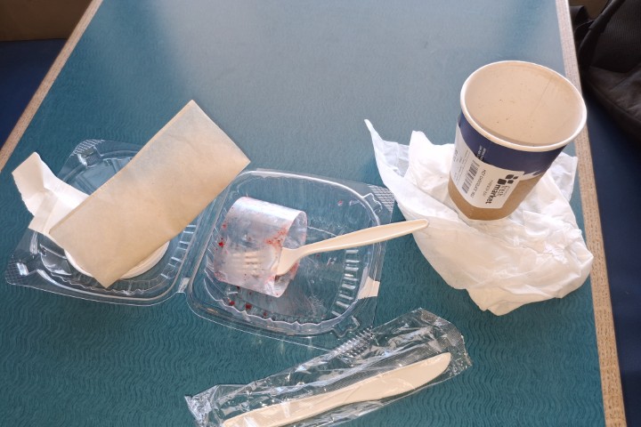 Auf dem Rückweg mache ich Station im Supermarkt, gönne mir eine heiße Schokolade mit einem Teilchen. Wenn ich das nur gewusst hätte! Ich bekomme dermaßen viel Plastik in die Hand gedrückt. Siehe Bild! Ich weiß nicht, wie viel Umweltärger ein Teller, eine Gabel und ein Becher zu waschen machen, aber ich denke mal, deutlich weniger. Das Vergnügen werde ich mir also in Zukunft versagen!