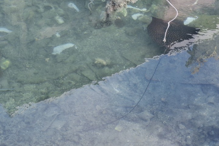 An der Brücke bei den kleinen Holzbuden schwimmt ein gewaltiger, wunderbar gefleckter Manta im flachen Wasser. Doch bis ich den Fotoapparat klar habe, sind nur noch kleine zu sehen. Ich versuche trotzdem ein Foto!