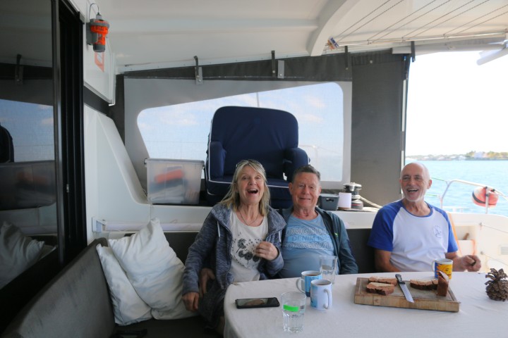 Nun denn – ich bringe sie also an Land und mache mir mit Friedrich einen schönen Tag. Er ist ja im Wesentlichen bewegungsunfähig mit seinem kaputten Knie. Den Niedergang in den Backbord-Rumpf geht er rückwärts und eigentlich nur „schwebend“ an allen Griffen festhaltend.