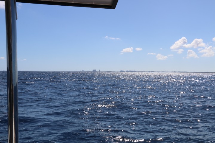 In der Nacht ist – mal wieder – die Milchstraße zu sehen. Neben den vielen Sternen leuchten am Horizont überall helle Flecken. Hinter mir – klar, da leuchtet Nassau. Und ob das vor mir schon die USA sind? Miami ist noch 150 km weg!!?? Mond gibt’s heute keinen – gar keinen. Neumond 100%.